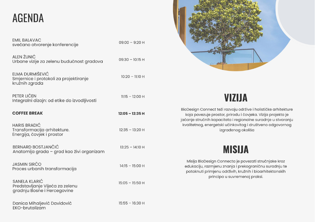 Fokus konferencije stavljen je na održive materijale, kružnu i modularnu gradnju, biofilijski dizajn, energetsku efikasnost te arhitekturu usmjerenu na čovjeka i okoliš.